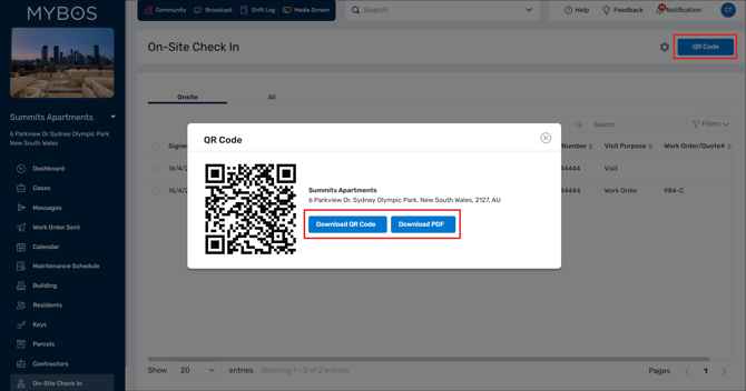 - Click on the QR Code button. This will display the QR code for your building that can be downloaded/printed for distribution.