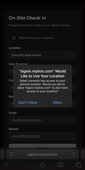- You can request a geolocation from your Visitor/Contractor under Geolocation Services. This won't track their movement directly, but will allow you to control if they can sign in outside of the set radius, or be automatically signed out when they leave the radius.