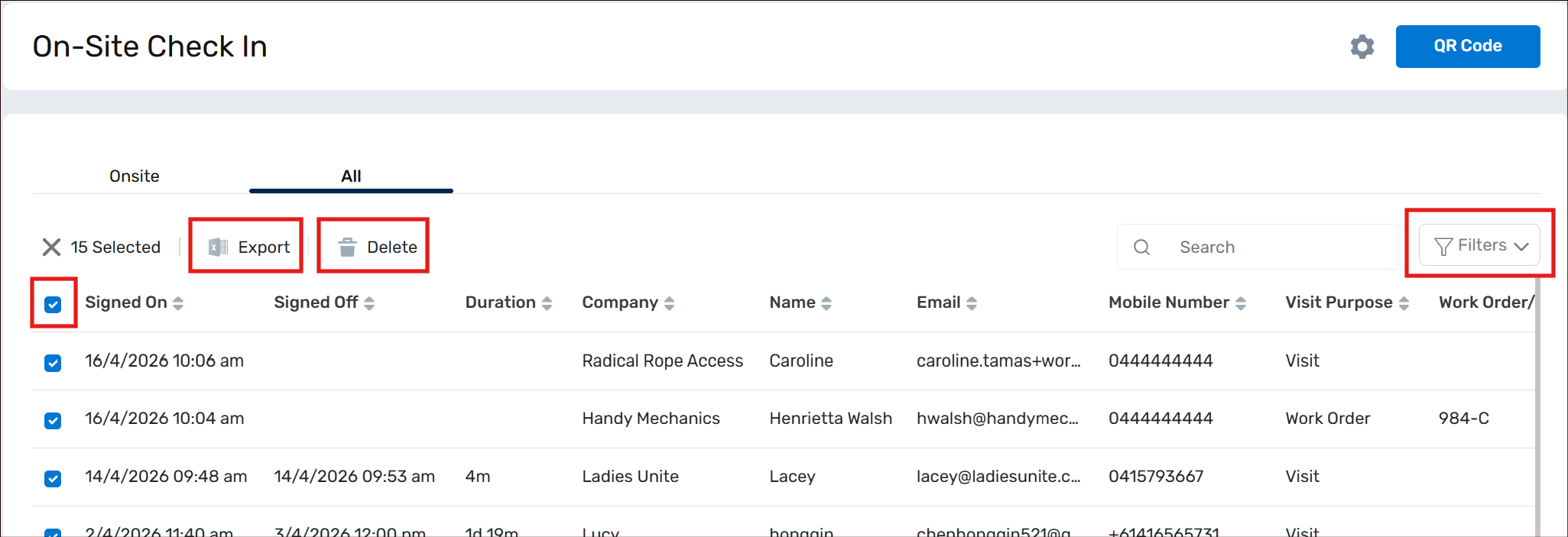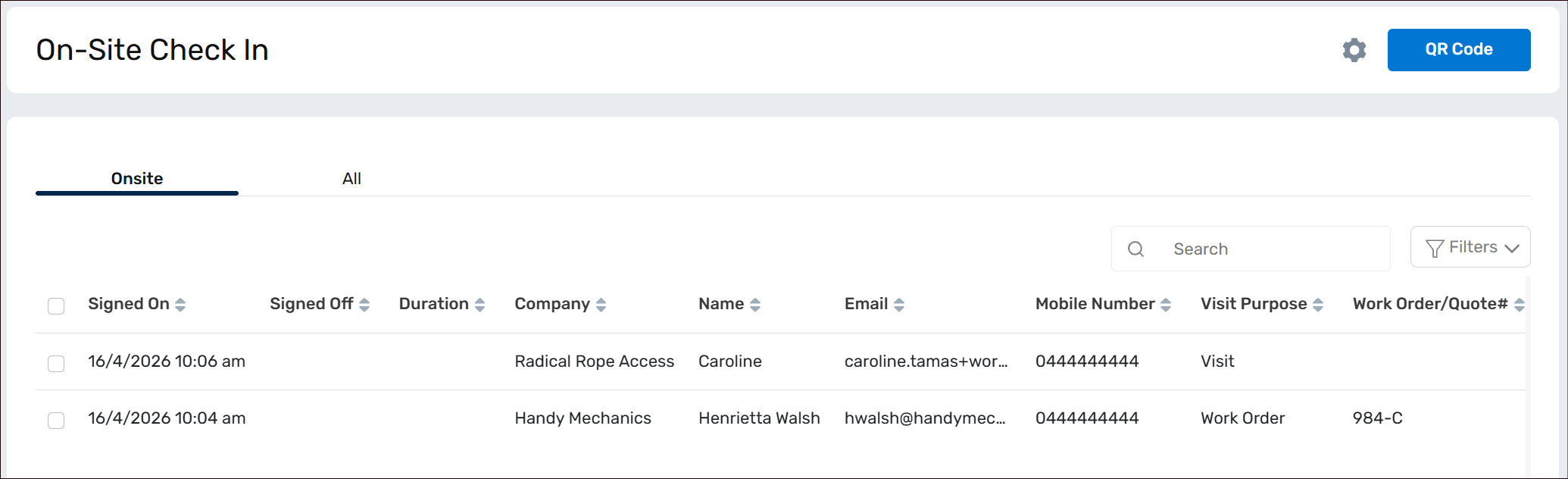 - Back in the Building Portal -> On-Site Check In, the Onsite tab will show a list of all Visitor/Contractors that are currently within the Building. The All tab will show both past and current Visitor/Contractors to the Building.
