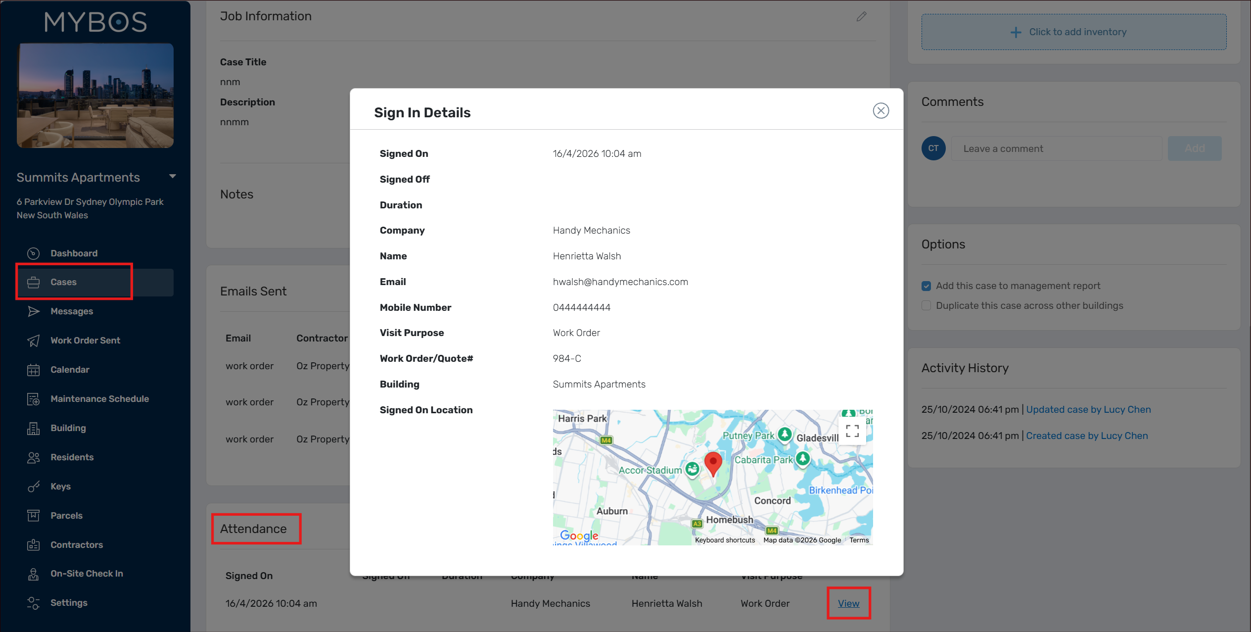- You can also view the Contractor Check Ins against their relevant Cases by going to those separate areas within your Building, and scrolling to the bottom.