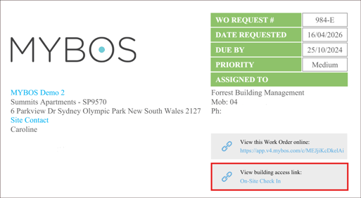 - The Work Orders and Quotes also contain a URL which a Contractor can click on to access the Check In
